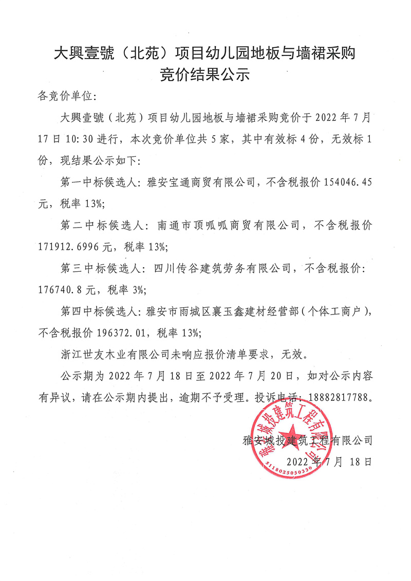 大興壹號(hào)(北苑)項(xiàng)目幼兒園地板與墻裙競價(jià)結(jié)果公示