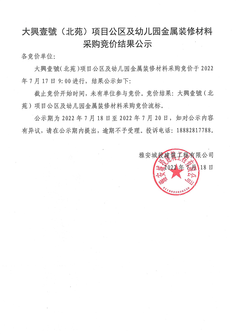 大興壹號(hào)(北苑)項(xiàng)目公區(qū)及幼兒園金屬裝修材料采購競價(jià)結(jié)果公示