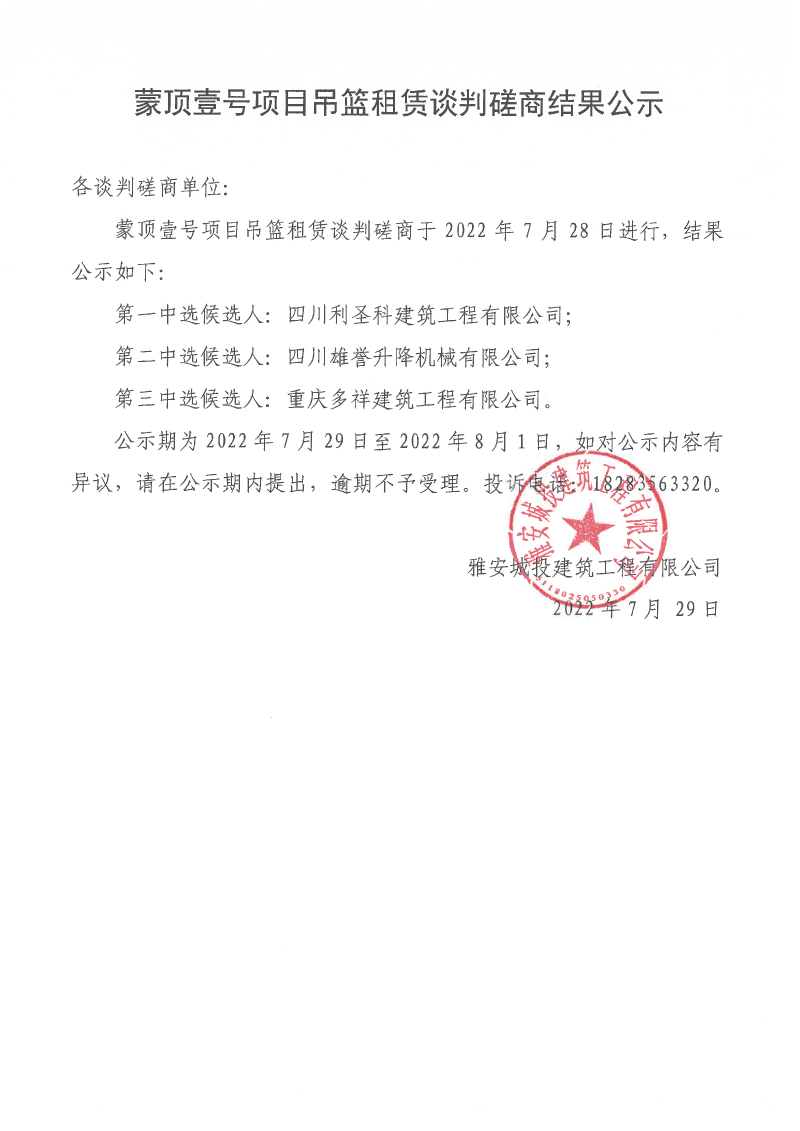 蒙頂壹號項(xiàng)目吊籃租賃談判磋商結(jié)果公示