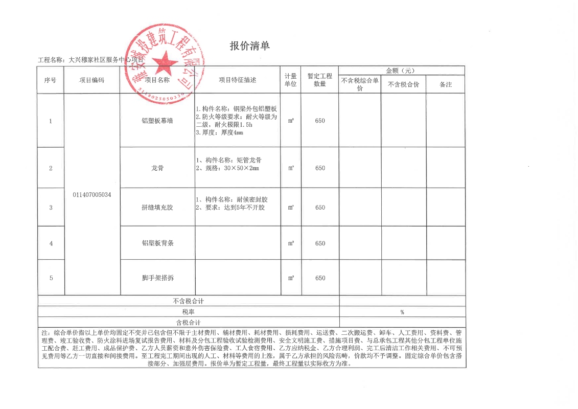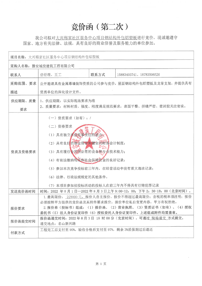 大興穆家社區(qū)服務(wù)中心項目鋼結(jié)構(gòu)外包鋁塑板競價公告(第二次)