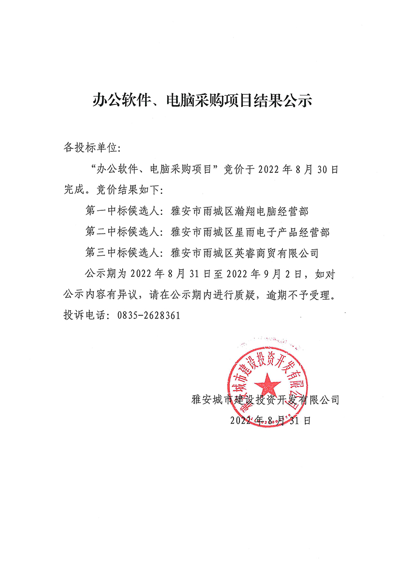 雅安城市建設投資開發(fā)有限公司辦公軟件、電腦采購項目結果公示