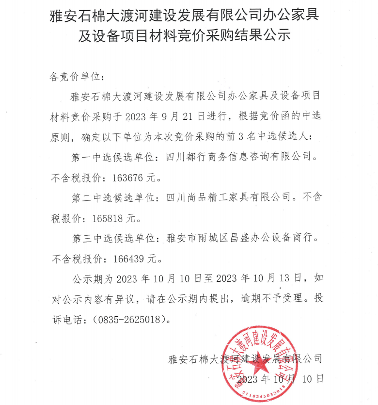 雅安石棉大渡河建設(shè)發(fā)展有限公司辦公家具及設(shè)備項(xiàng)目材料競(jìng)價(jià)采購結(jié)果公示