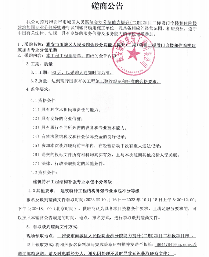 雅安市雨城區(qū)人民醫(yī)院金沙分院能力提升(二期)項(xiàng)目二標(biāo)段門診樓和住院樓建筑加固專業(yè)分包采購談判磋商公告