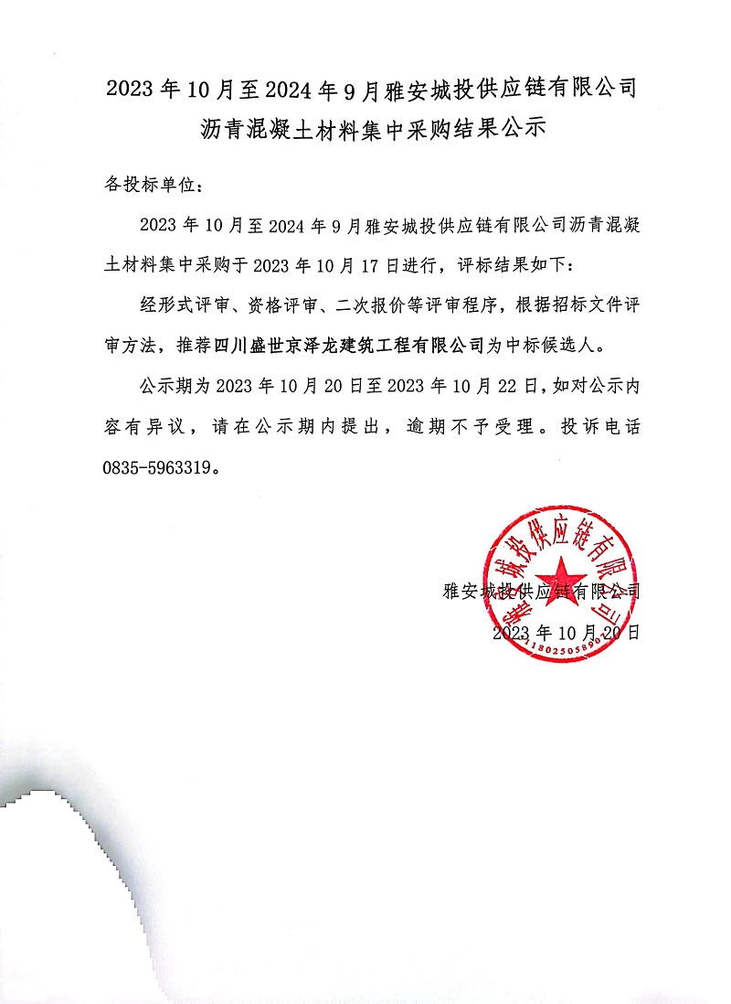 2023年10月至2024年9月雅安城投供應(yīng)鏈有限公司瀝青混凝土材料集中采購結(jié)果公示