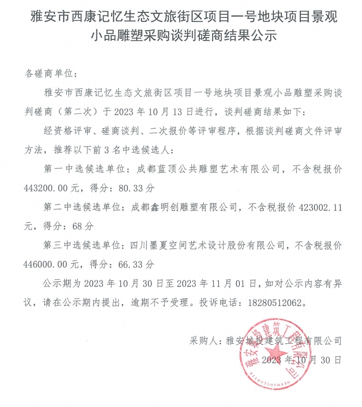 雅安市西康記憶生態(tài)文旅街區(qū)項(xiàng)目一號(hào)地塊項(xiàng)目景觀小品雕塑采購談判磋商結(jié)果公示