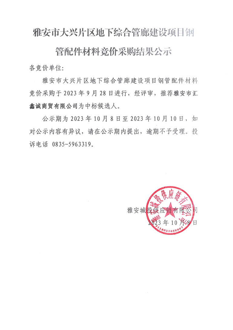 雅安市大興片區(qū)地下綜合管廊建設(shè)項(xiàng)目鋼管配件材料競(jìng)價(jià)采購(gòu)結(jié)果公示