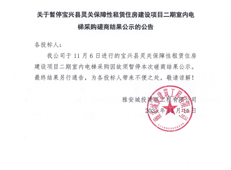 關(guān)于暫停寶興縣靈關(guān)保障性租賃住房建設(shè)項目二期室內(nèi)電梯采購磋商結(jié)果公示的公告