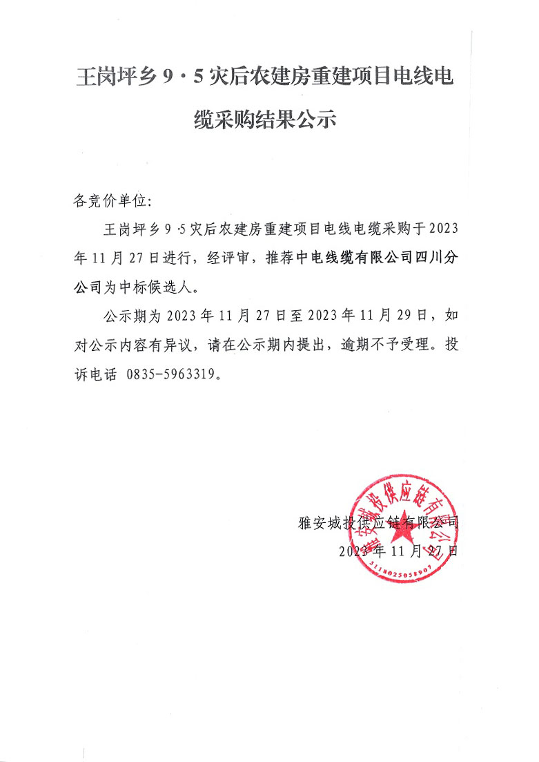 王崗坪鄉(xiāng)9·5災后農(nóng)建房重建項目電線電纜采購結(jié)果公示