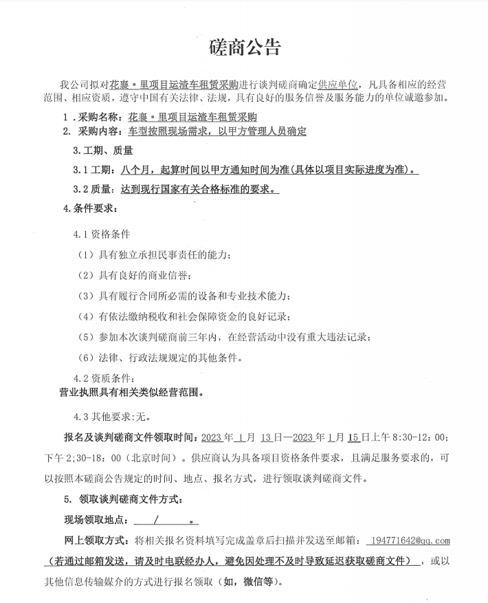 花襄·里項目運(yùn)渣車租賃采購談判磋商公告