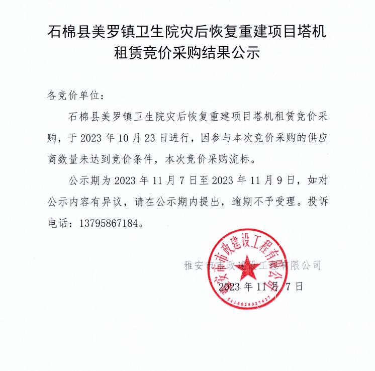 石棉縣美羅鎮(zhèn)衛(wèi)生院災后恢復重建項目塔機租賃競價采購結(jié)果公示