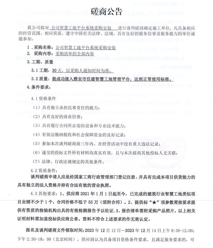 公司智慧工地平臺(tái)系統(tǒng)采購(gòu)安裝談判磋商公告
