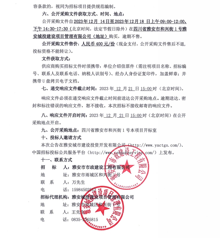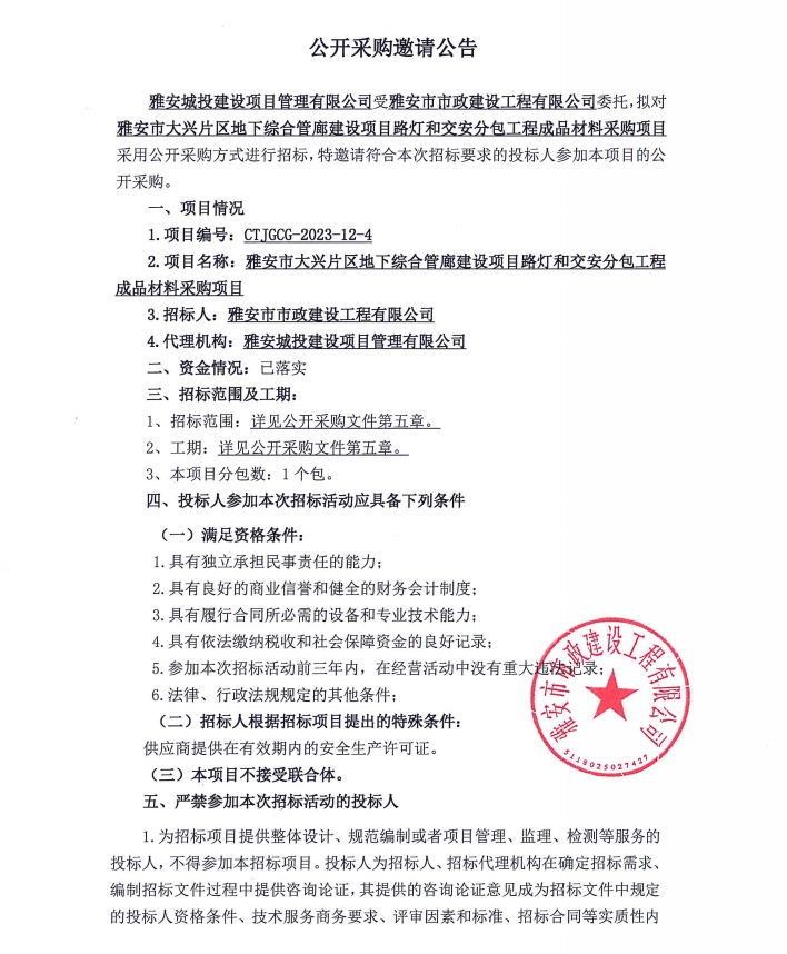 雅安市大興片區(qū)地下綜合管廊建設(shè)項(xiàng)目路燈和交安分包工程成品材料采購項(xiàng)目公開采購邀請公告