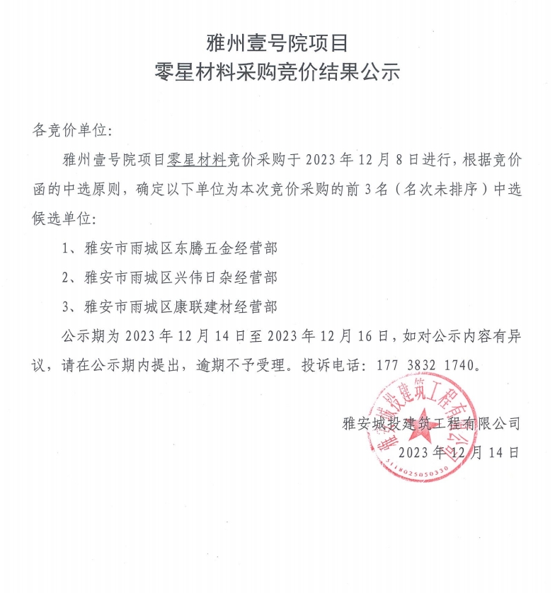 雅州壹號院項目零星材料采購競價結果公示