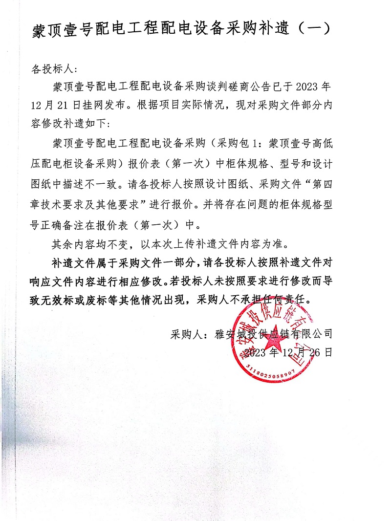 蒙頂壹號配電工程配電設(shè)備采購補遺(一)
