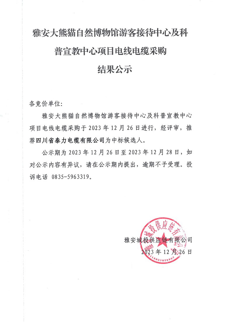 雅安大熊貓自然博物館游客接待中心及科普宣教中心項目電線電纜采購結果公示