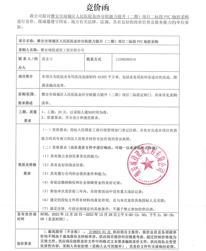 雅安市雨城區(qū)人民醫(yī)院金沙分院能力提升(二期)項目二標段PVC地膠采購競價公告
