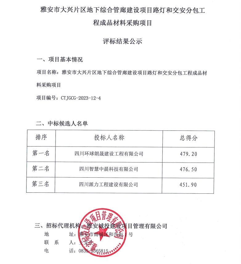 雅安市大興片區(qū)地下綜合管廊建設(shè)項目路燈和交安分包工程成品材料采購項目評標(biāo)結(jié)果公示