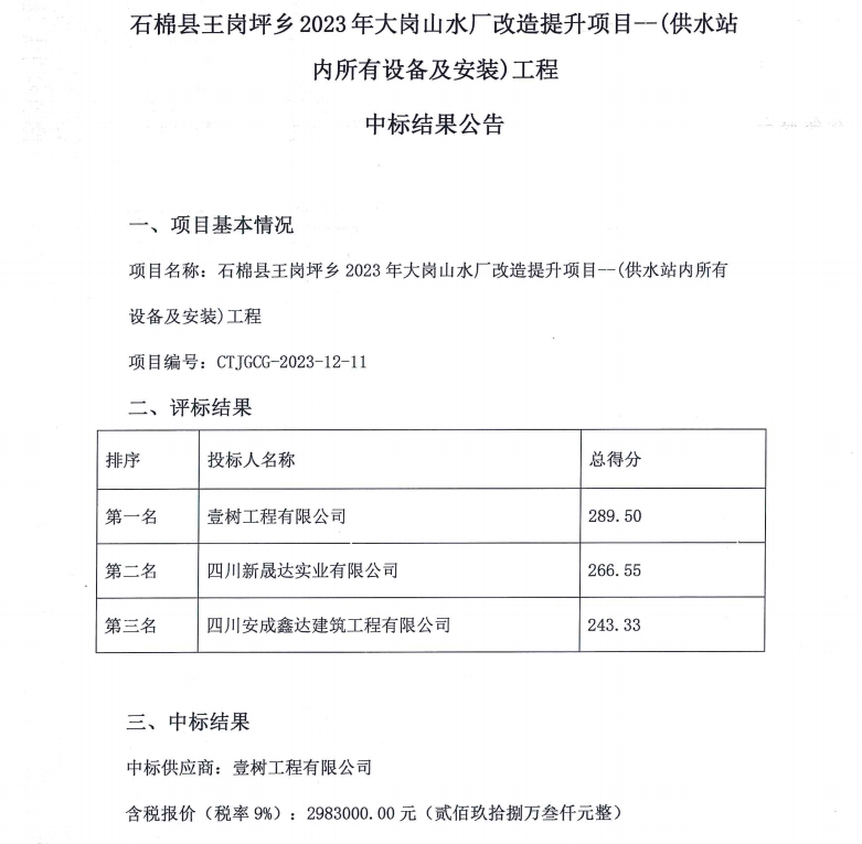 石棉縣王崗坪鄉(xiāng)2023年大崗山水廠改造提升項(xiàng)目--(供水站內(nèi)所有設(shè)備及安裝)工程中標(biāo)結(jié)果公告