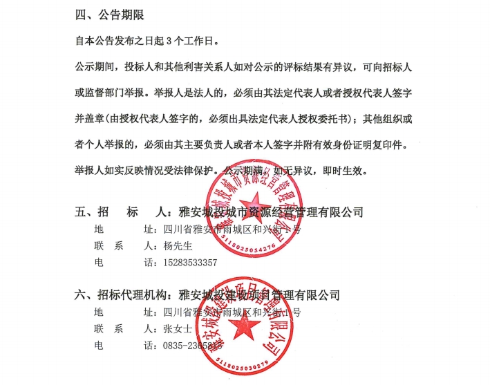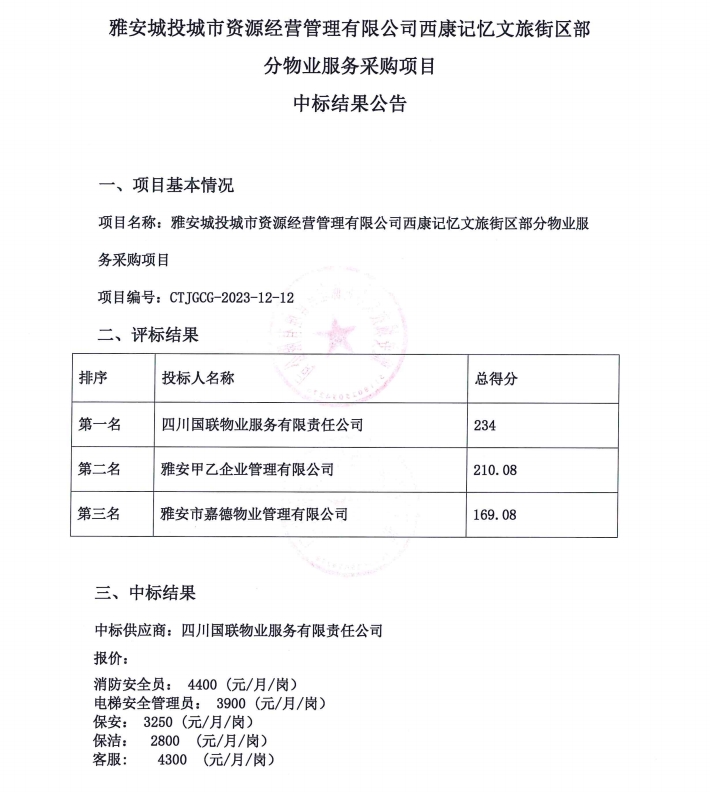 雅安城投城市資源經(jīng)營(yíng)管理有限公司西康記憶文旅街區(qū)部分物業(yè)服務(wù)采購(gòu)項(xiàng)目中標(biāo)結(jié)果公告