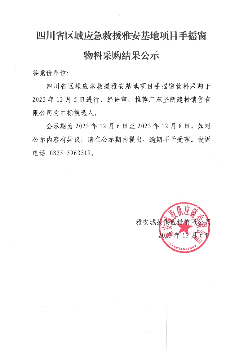 四川省區(qū)域應急救援雅安基地項目手搖窗物料采購結(jié)果公示