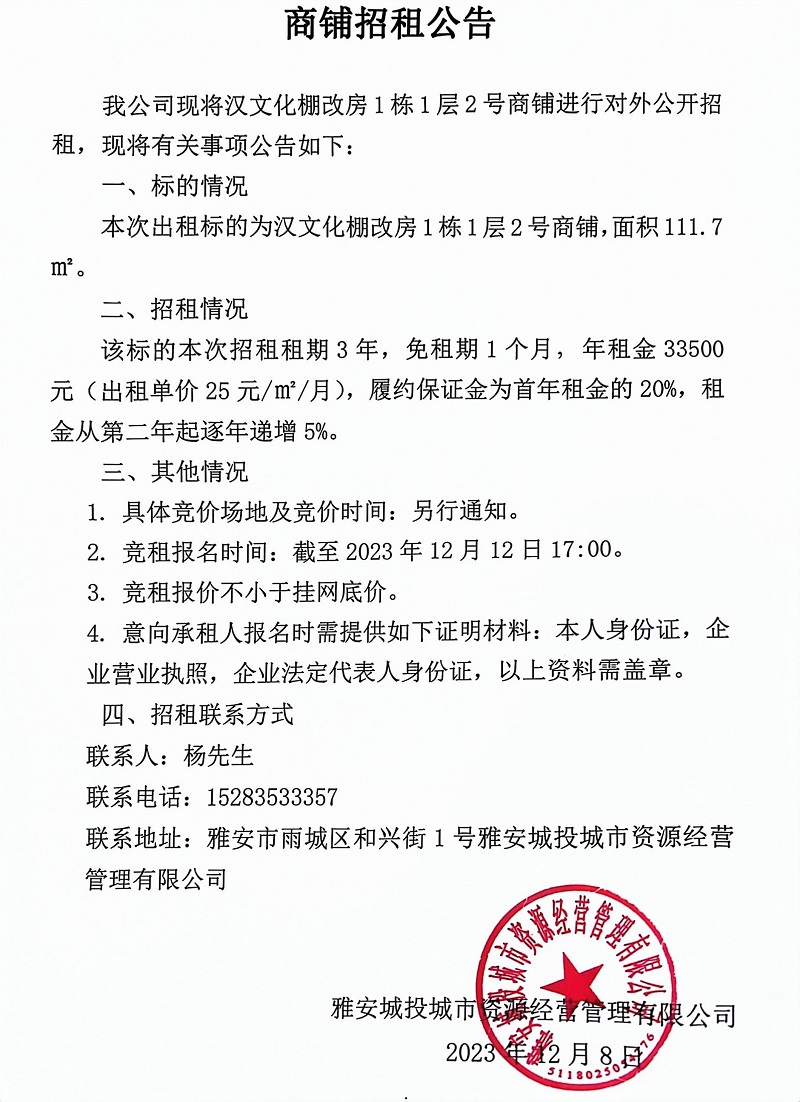 漢文化棚改房1棟1層2號商鋪招租公告