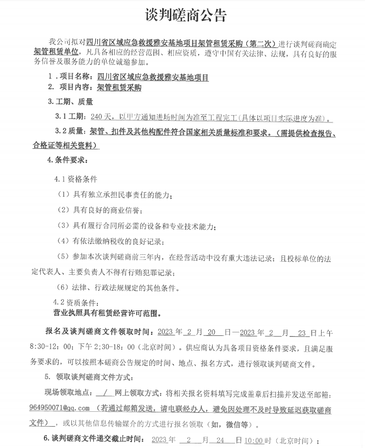 四川省區(qū)域應(yīng)急救援雅安基地項(xiàng)目架管租賃采購(gòu)(第二次)談判磋商公告