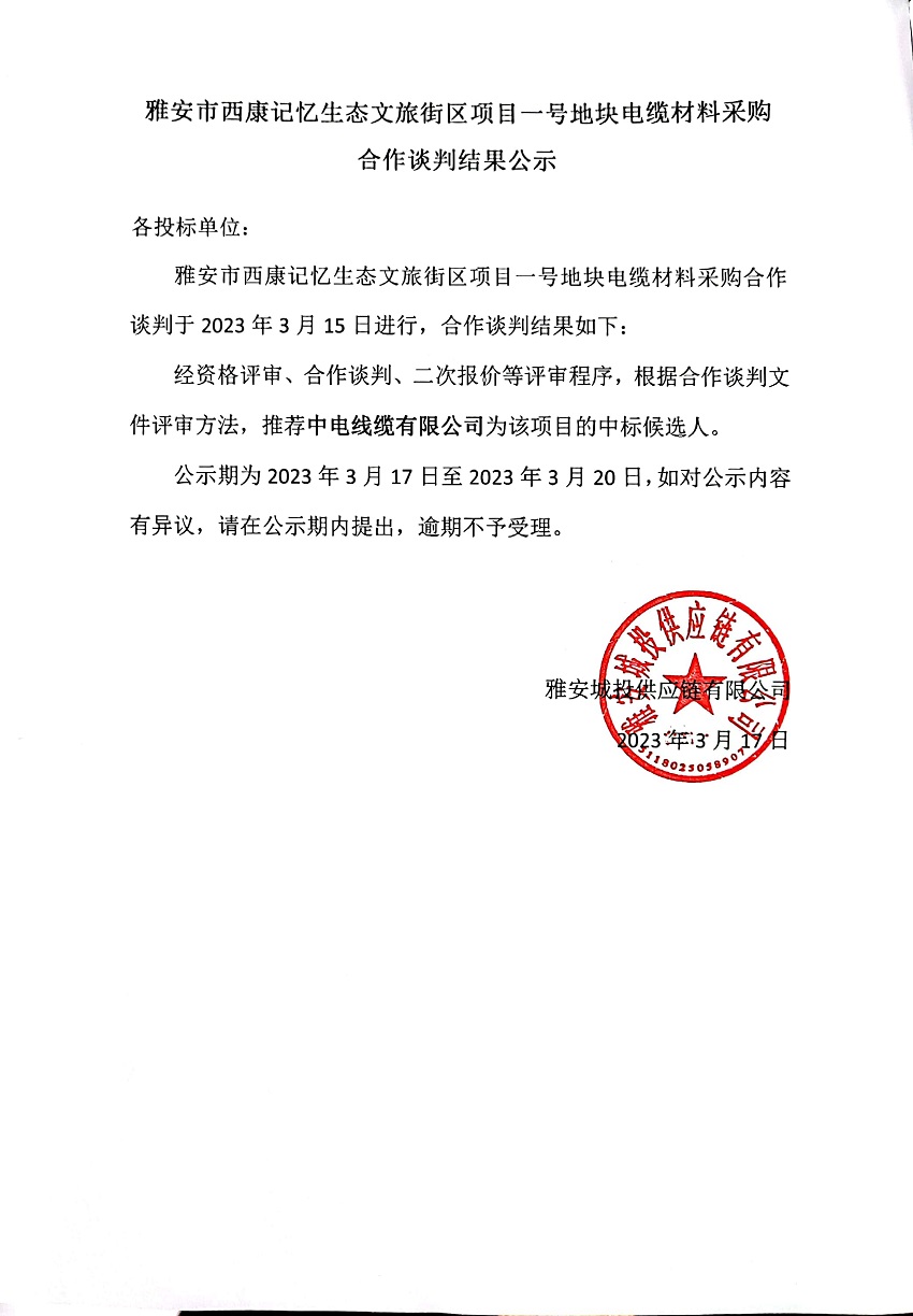 雅安市西康記憶生態(tài)文旅街區(qū)項目一號地塊電纜材料采購合作談判結果公示