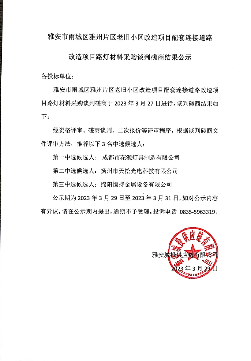 雅安市雨城區(qū)雅州片區(qū)老舊小區(qū)改造項目配套連接道路改造項目路燈材料采購談判磋商結(jié)果公示