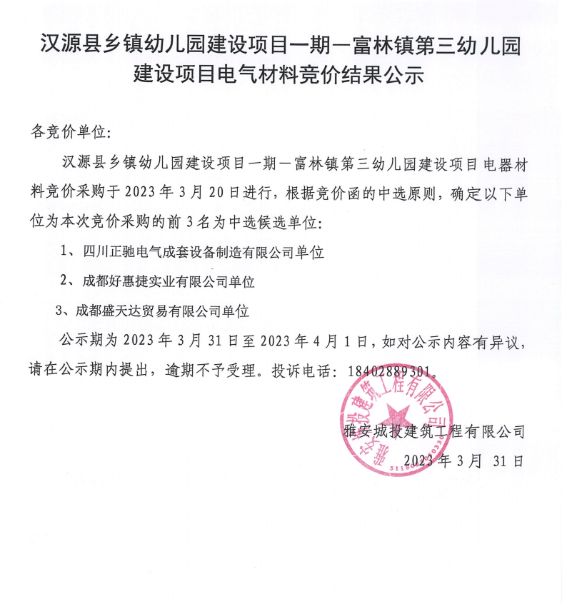 漢源縣鄉(xiāng)鎮(zhèn)幼兒園建設(shè)項(xiàng)目一期一富林鎮(zhèn)第三幼兒園建設(shè)項(xiàng)目電氣材料競(jìng)價(jià)結(jié)果公示