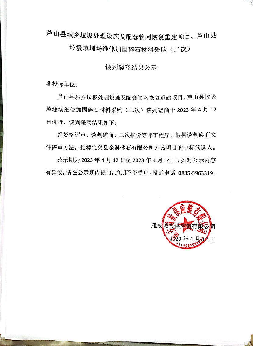 蘆山縣城鄉(xiāng)垃圾處理設(shè)施及配套管網(wǎng)恢復(fù)重建項(xiàng)目、蘆山縣垃圾填埋場維修加固碎石材料采購(二次)談判磋商結(jié)果公示