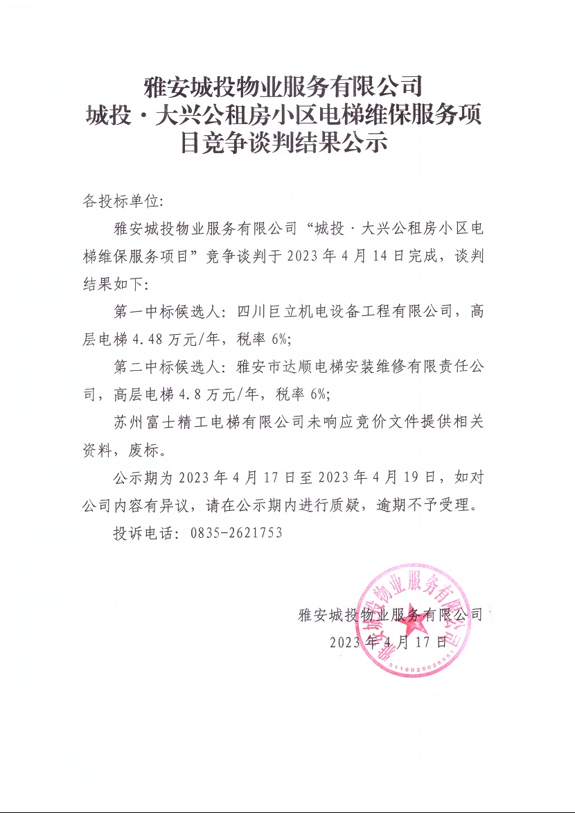 雅安城投物業(yè)有限公司城投·大興公租房小區(qū)電梯維保服務(wù)項(xiàng)目競(jìng)爭(zhēng)談判結(jié)果公示