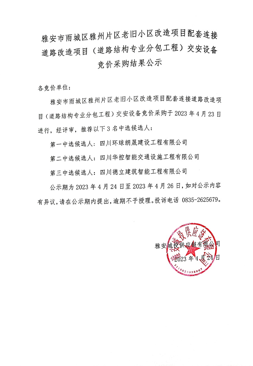 雅安市雨城區(qū)雅州片區(qū)老舊小區(qū)改造項目配套連接道路改造項目(道路結構專業(yè)分包工程)交安設備競價采購結果公示