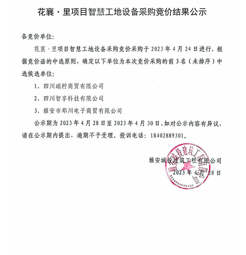 花襄·里項(xiàng)目智慧工地設(shè)備采購競價(jià)結(jié)果公示