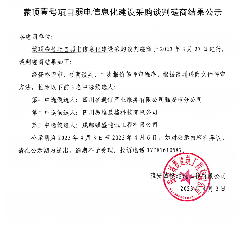 蒙頂壹號(hào)項(xiàng)目弱電信息化建設(shè)采購(gòu)談判磋商結(jié)果公示