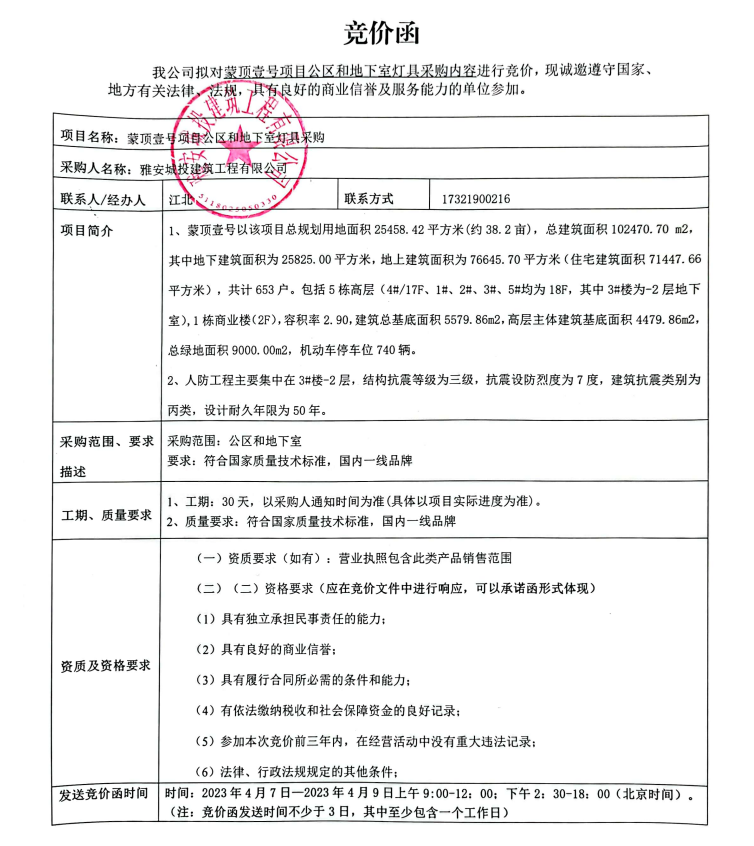 蒙頂壹號(hào)項(xiàng)目公區(qū)和地下室燈具采購(gòu)競(jìng)價(jià)公告