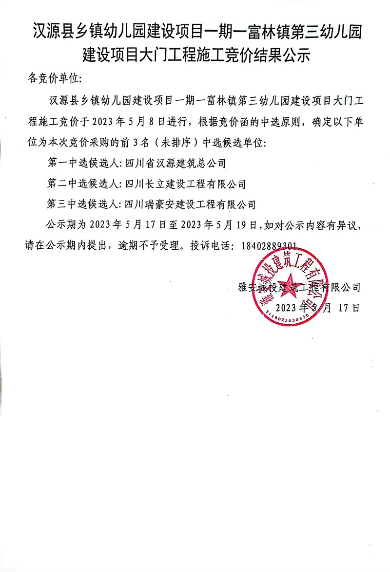 漢源縣鄉(xiāng)鎮(zhèn)幼兒園建設(shè)項(xiàng)目一期一富林鎮(zhèn)第三幼兒園建設(shè)項(xiàng)目大門(mén)工程施工競(jìng)價(jià)結(jié)果公示