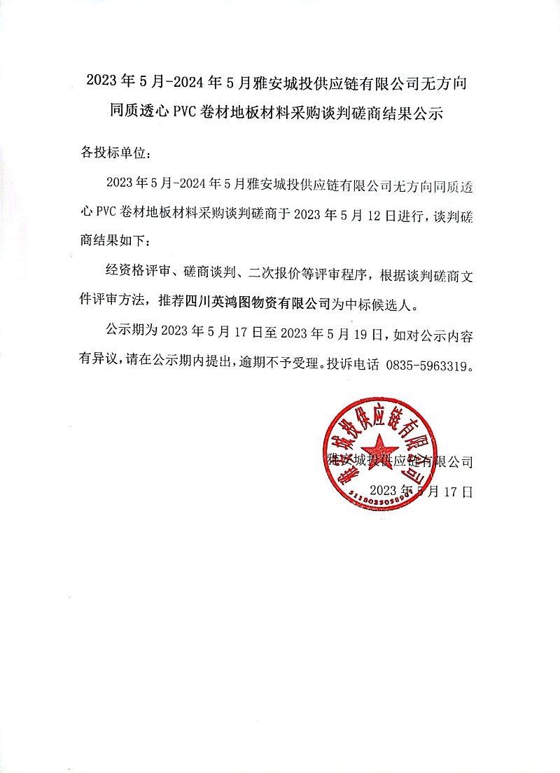 2023年5月-2024年5月雅安城投供應(yīng)鏈有限公司無方向同質(zhì)透心PVC卷材地板材料采購談判磋商結(jié)果公示