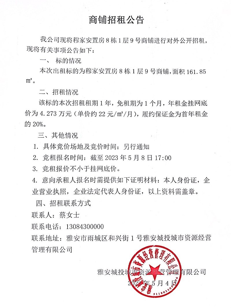 穆家安置房8棟1層9號(hào)商鋪招租公告