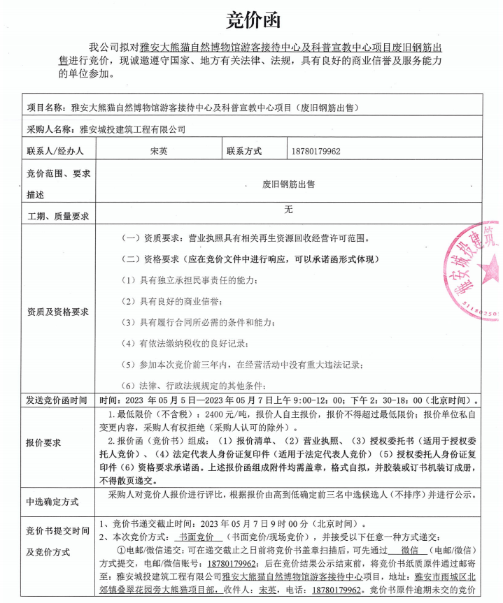雅安大熊貓自然博物館游客接待中心及科普宣教中心項(xiàng)目廢舊鋼筋出售競價公告