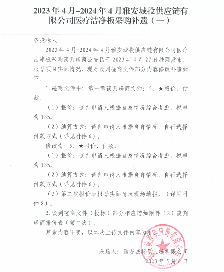 2023年4月-2024年4月雅安城投供應(yīng)鏈有限公司醫(yī)療潔凈板采購補(bǔ)遺(一)