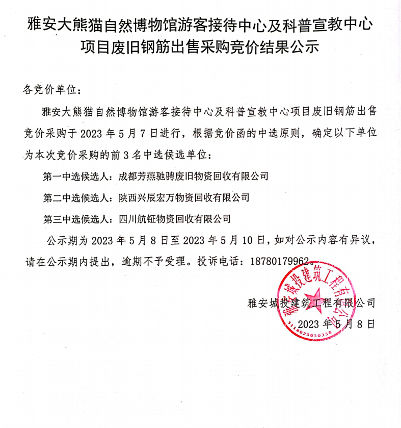雅安大熊貓自然博物館游客接待中心及科普宣教中心項(xiàng)目廢舊鋼筋出售采購競(jìng)價(jià)結(jié)果公示