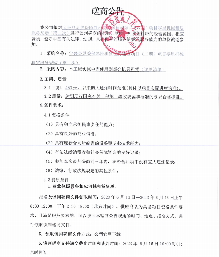 寶興縣靈關(guān)保障性租賃住房建設(shè)項(xiàng)目(二期)項(xiàng)目零星機(jī)械租賃服務(wù)采購(第二次)談判磋商公告
