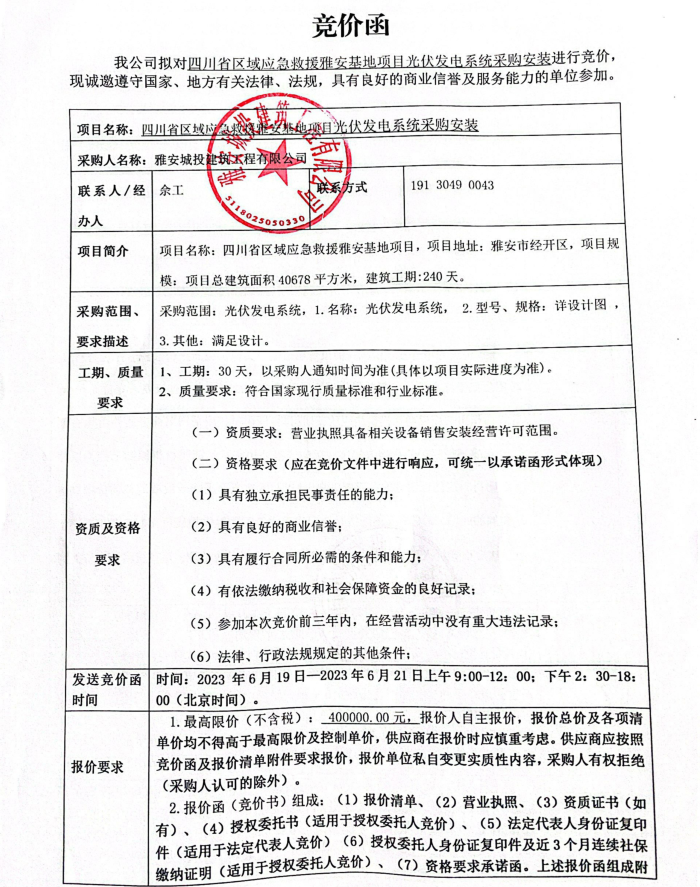 四川省區(qū)域應(yīng)急救援雅安基地項(xiàng)目光伏發(fā)電系統(tǒng)采購安裝競(jìng)價(jià)公告
