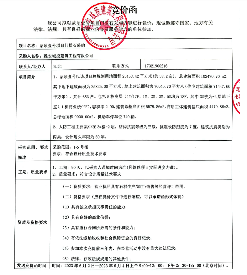 蒙頂壹號項目門檻石采購競價公告