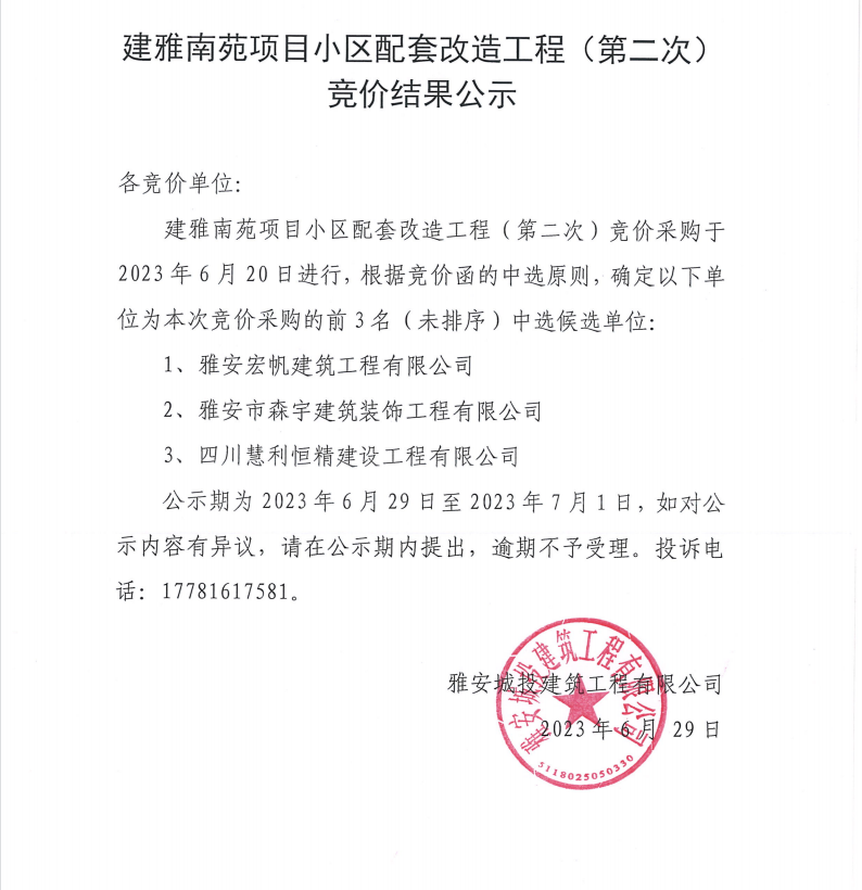 建雅南苑項(xiàng)目小區(qū)配套改造工程(第二次)競價(jià)結(jié)果公示