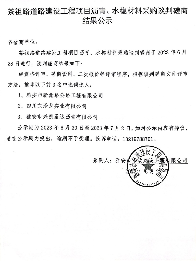 茶祖路道路建設(shè)工程瀝青、水穩(wěn)采購(gòu)談判磋商結(jié)果公示