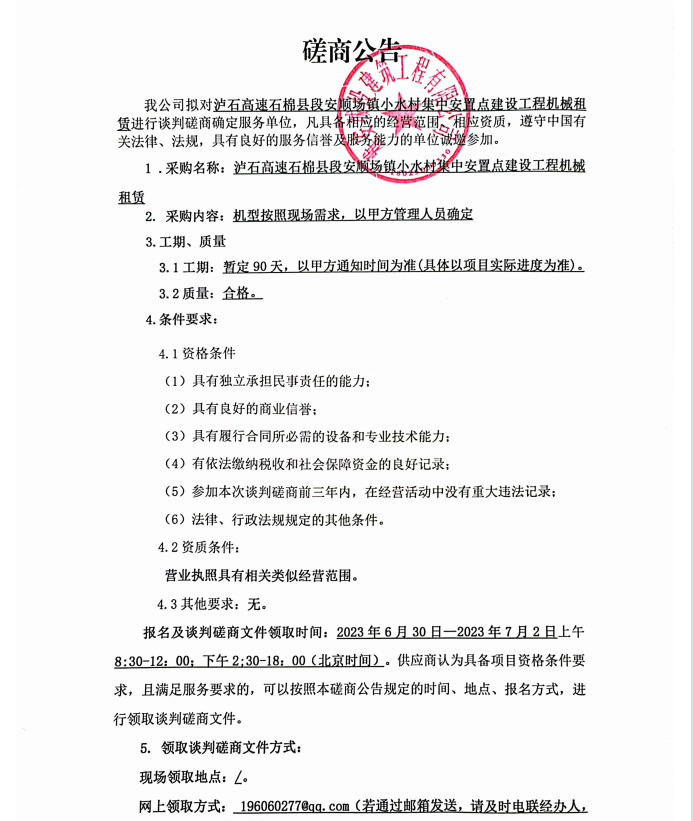 瀘石高速石棉縣段安順場鎮(zhèn)小水村集中安置點建設(shè)工程機械租賃談判磋商公告