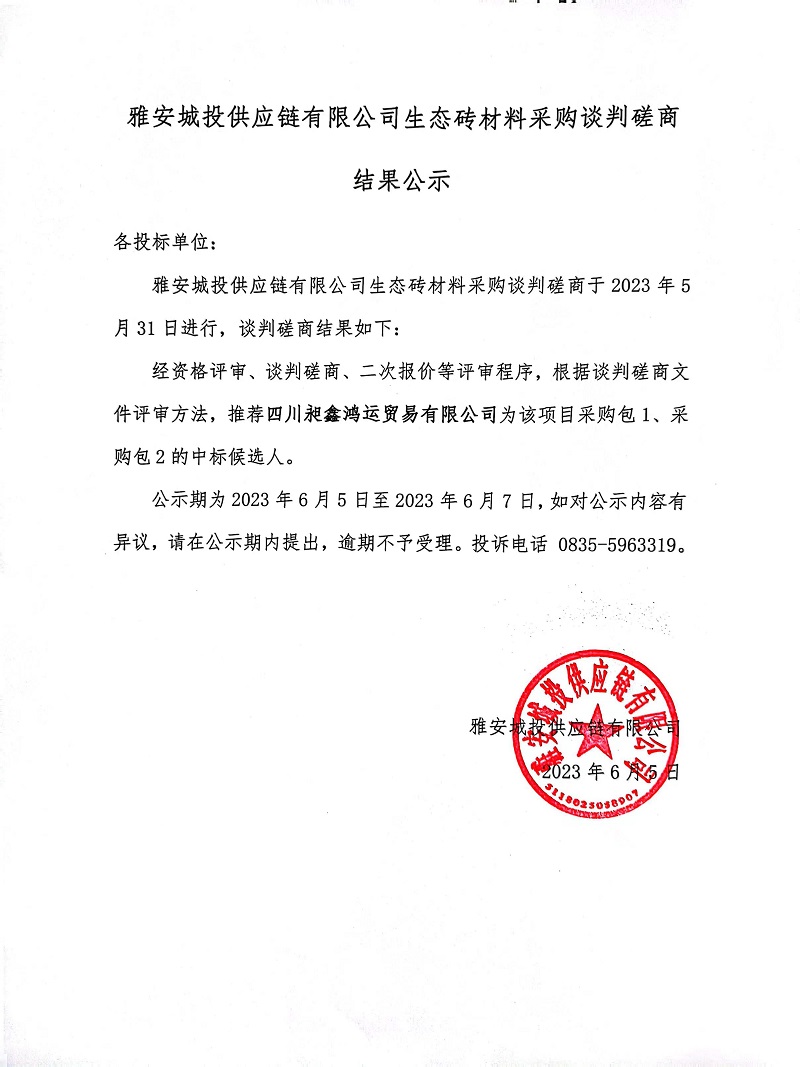 雅安城投供應鏈有限公司生態(tài)磚材料采購談判磋商結果公示