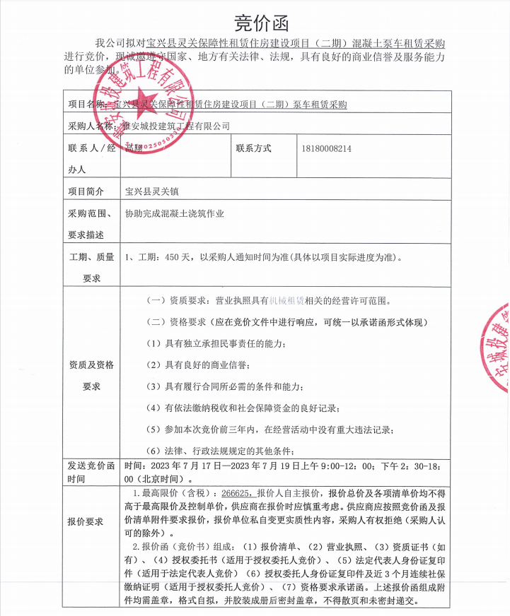 寶興縣靈關(guān)保障性租賃住房建設(shè)項(xiàng)目(二期)混凝土泵車租賃采購競價公告