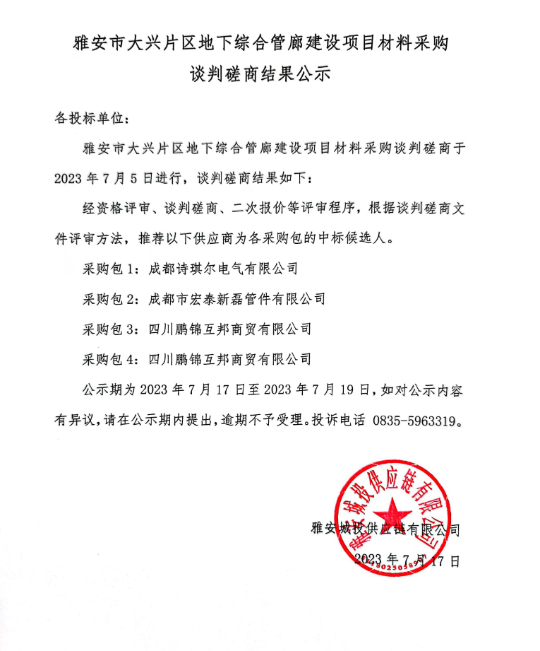 雅安市大興片區(qū)地下綜合管廊建設(shè)項目材料采購談判磋商結(jié)果公示